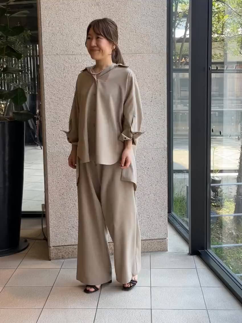 柔らかさとほどよいハリ感を兼ね備えたドライトロ素材は、肌あたりも良く、さらっと快適な着心地。ベージュのワントーンが優しく上品な印象に。