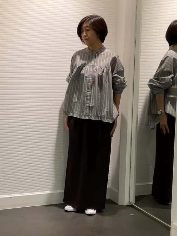 秋っぽさも感じさせるブラウスは前後差があるのでスカートにアウトで合わせてもバランス◎