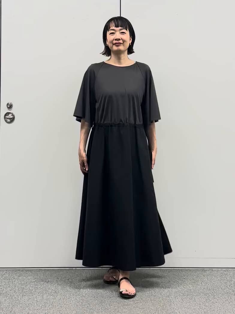 チャコール×ブラックの落ち着いた配色が上品な印象のドッキングワンピース。