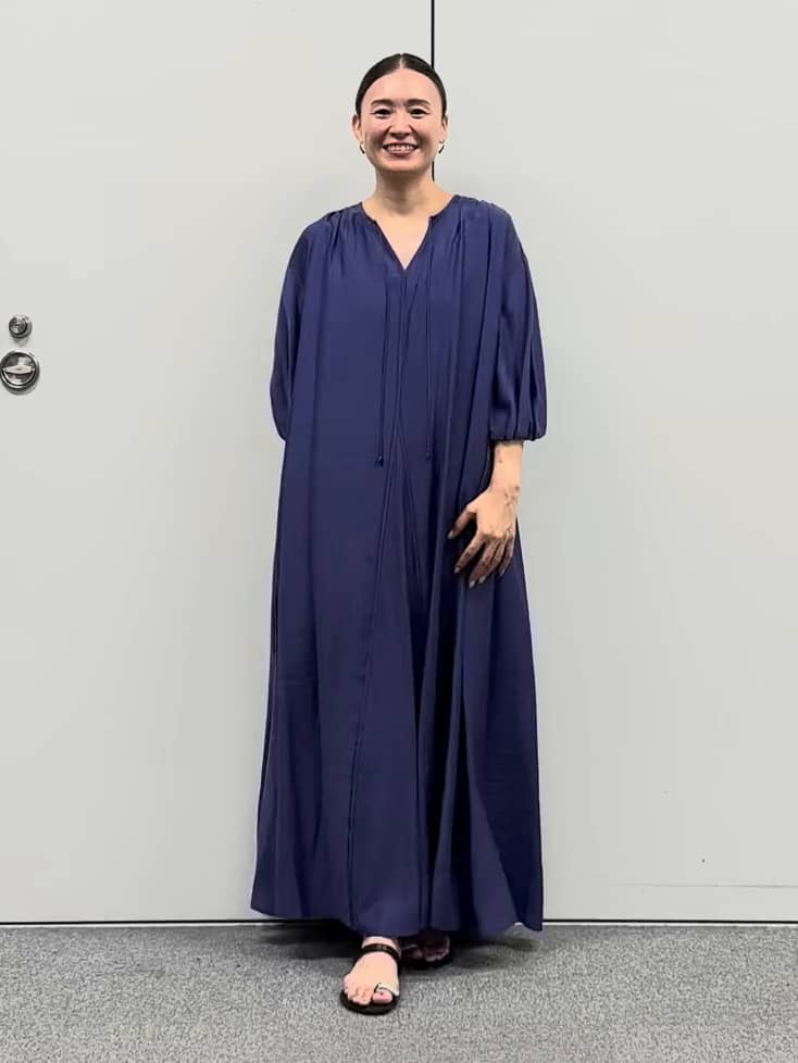 上品な光沢とドレープ感が魅力のAラインワンピース。ギャザーや飾りステッチ、キーネックのリボンなど、細部にこだわった一枚。透け感のある素材ながらキャミドレス付きで安心です。