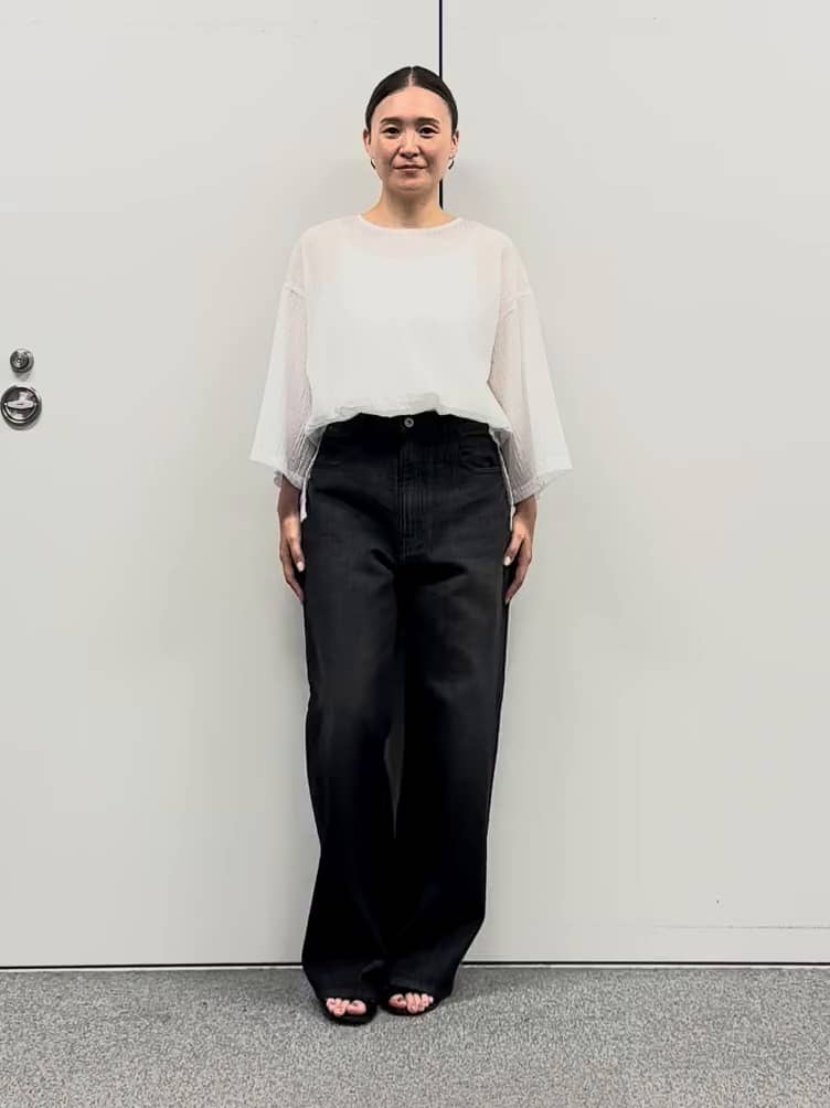 合わせたワイドデニムは、新色のブラック。ジャストウエストではける太めのシルエットで、短丈トップスやブラウスをインした着こなしにもバランス良くマッチ。落ち着いたブラックカラーが、スタイリングをぐっと大人っぽく引き締めてくれます。