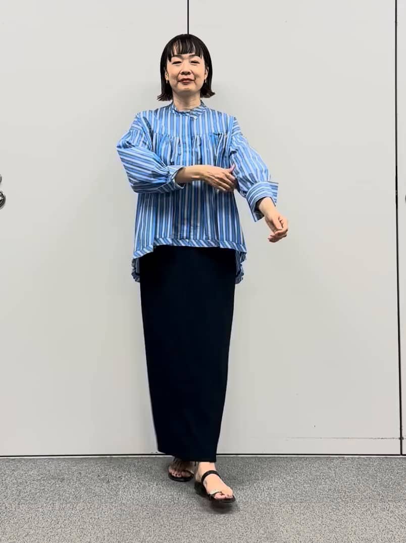 ビンテージ感のある表情豊かなブルーストライプブラウスに、凹凸素材のネイビースカートを合わせた上品カジュアル。前後差のあるAラインで、定番人気のfeeriqueのワイドデニムやタイトスカートとの相性が抜群です!