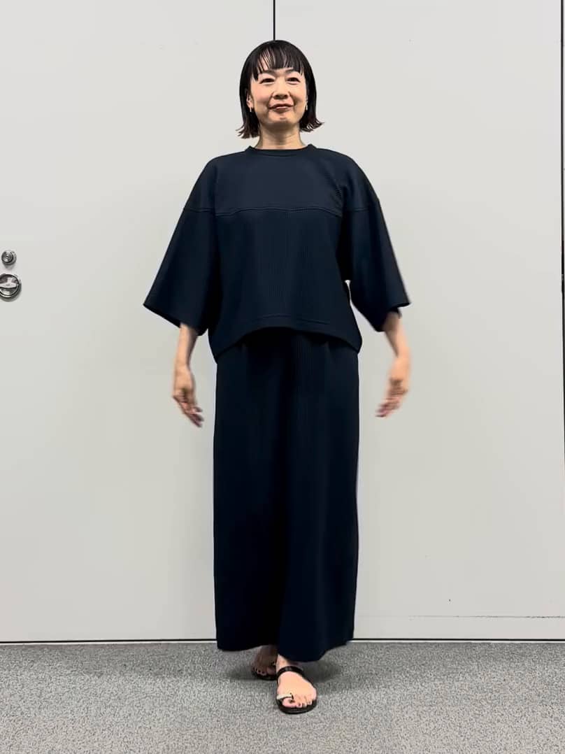 凹凸のあるキルト素材が上品見えし、シンプルながらも一枚で映えるセットアップ。ゆったりしたプルオーバーは涼しく、スカートはラインを拾わずすっきりとした印象に。旅行やお出かけ、通勤にもおすすめのきれいめカジュアルです◎