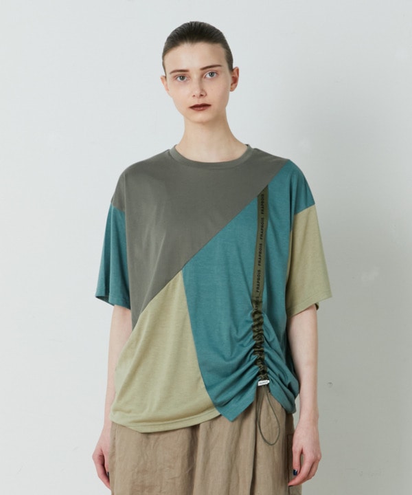 同系色の生地をパッチワークしたようなデザインのTシャツを、フラボア定番のムーブデニムと合わせました。