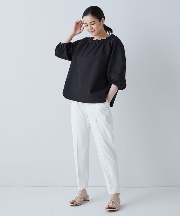 後ろのリボンデティールがフェミニンなスモッグブラウス。デコルテが美しく見えるネックラインもポイントです。ボトムはリラックスしたウエストゴムのワイドパンツです。9分丈のレングスが暑い季節に抜け感のある涼し気な1着です。