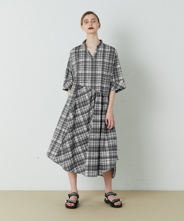 オリジナルのマドラスチェック生地を使用した、ゆったりとした着心地のワンピースをカラフルなサンダルと合わせました。