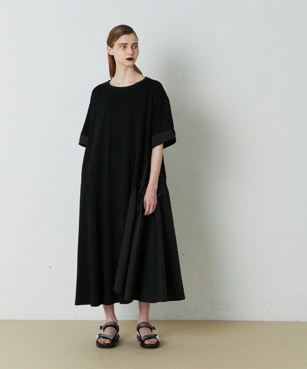 ワンピースは左裾に生地を摘まんで作ったパーツがドッキングしていて、ふんわりとしたシルエットを作っています。