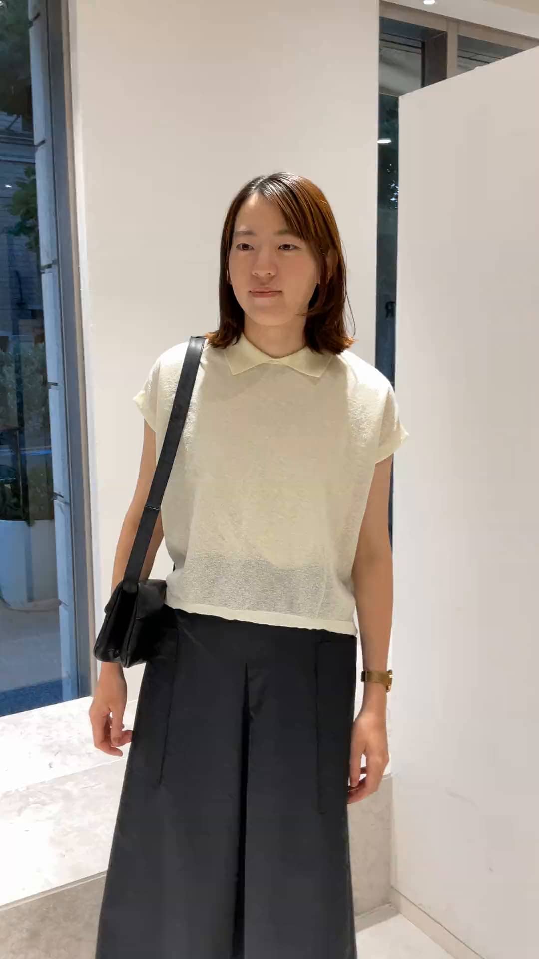 まだまだ暑い時期にもおすすめな透け感のあるニットポロ。今年は短め丈のタフタスカート。オフィスでもきちんと感のあるコーディネートに。