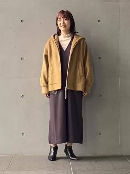 短め丈とほんのりAラインのシルエットが美しく、ダークブラウンのジャンバースカートを合わせて女性らしいフォルムとアクセントをプラスしたスタイリングがおすすめです◎