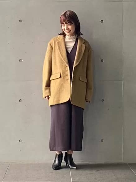 オーバーサイズなので、真冬は厚手のニットに重ねても◎今回はダークブラウンのジャンバースカートを合わせて、コントラストの効いたレイヤードスタイルにしています。