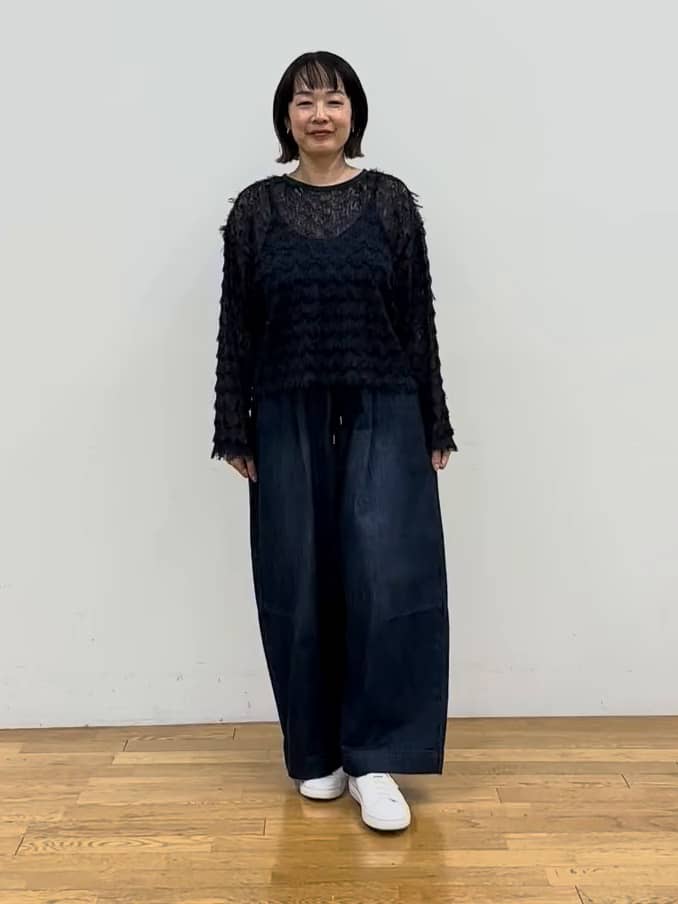 フリンジが可愛らしく、透け感もあるので、濃い色のコーデでも女性らしく仕上がります。