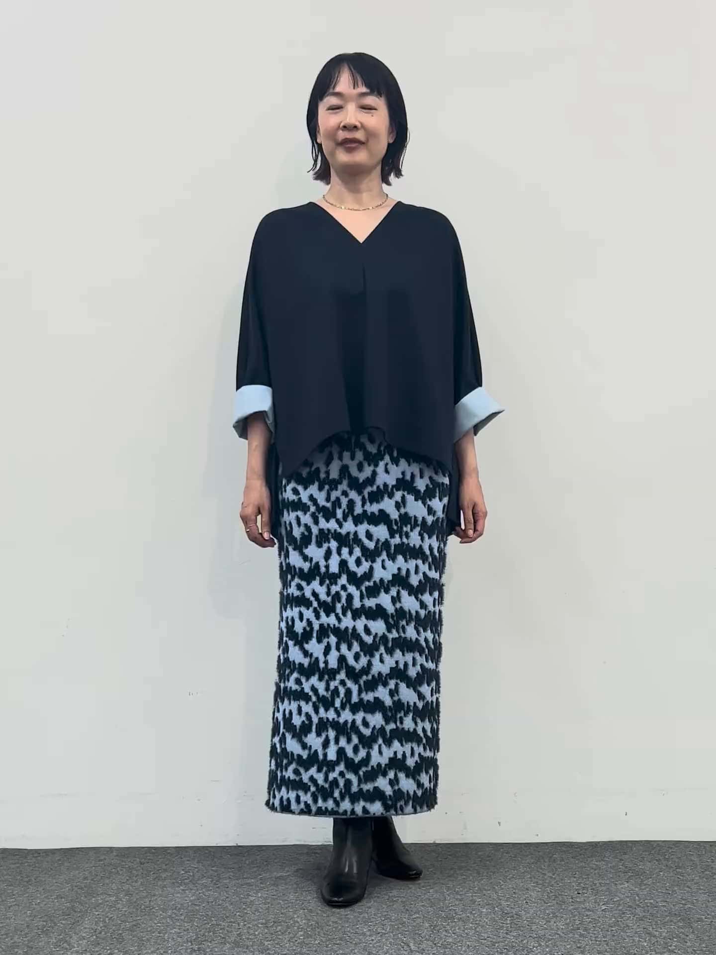 上品な光沢とスッキリした表面感が魅力のVネックドルマントップス。袖口の布帛配色を見せると、フェザーレオパードスカートとのバランスも抜群。ネイビートップスにサックススカートで、大人っぽく華やかなスタイルに仕上がります。柄感も派手すぎず、落ち着いた印象でコーディネートしやすいです。