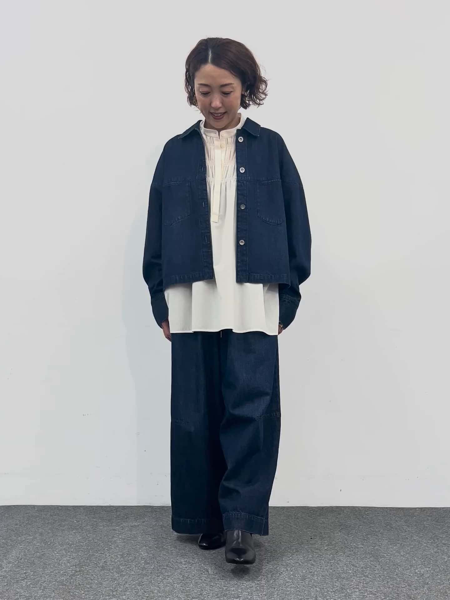 小柄な私でもバランスよく着られるセットアップです。ブルゾンは軽く羽織れて、朝晩の気温差にもぴったり。ワイドパンツはドロスト仕様でリラックス感も◎今回は2サイズのウエストを一折りして着用しているので、160cm以下の小柄な方は1サイズがおすすめです!