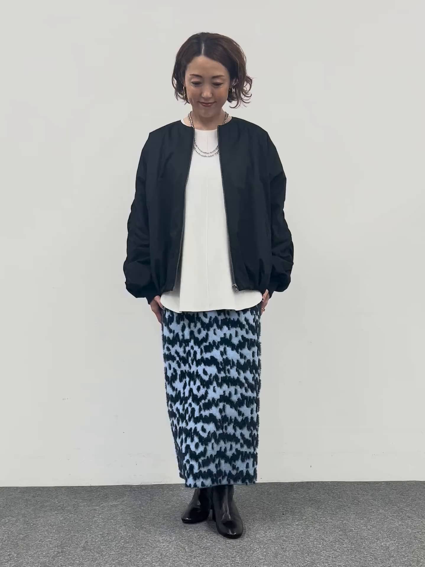 光沢感と軽さが魅力のバルーンショートブルゾンに、サックスのフェザーレオパードタイトスカートを合わせた大人可愛いコーデ♡袖のシャーリングやリブで華やかさとラフさをプラス。ニット素材なので、スカートは一折りしてもゴロゴロせず、丈感を調整できます。小柄な方はバランスを見ながら試してみてください!