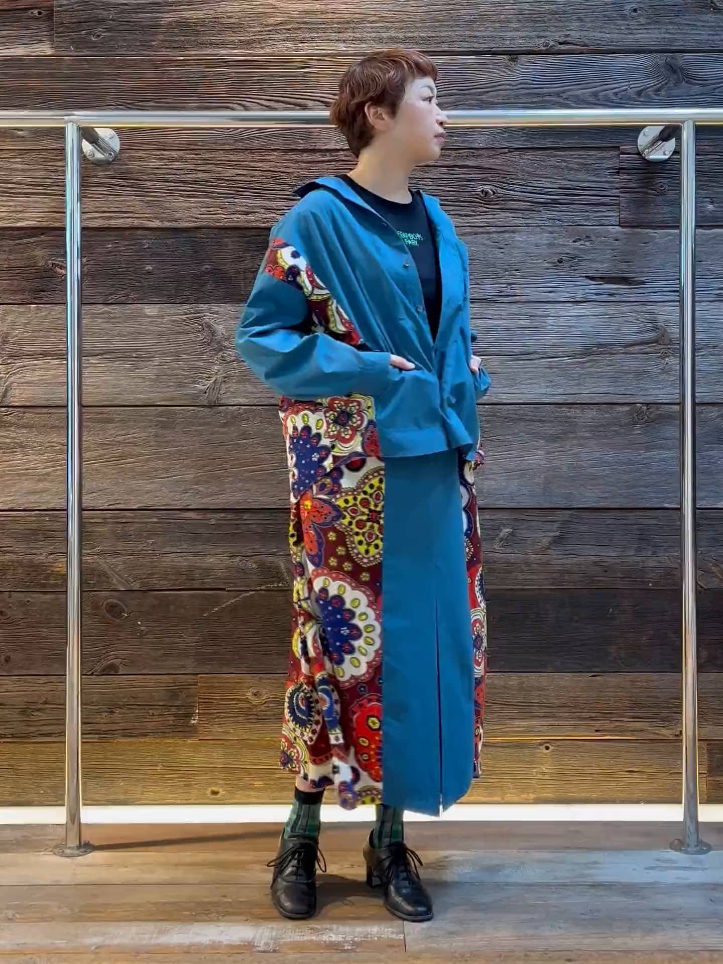 着用感 : ハリ感のあるポリエステル生地に、綿のような柔らかいスカーフ柄の生地を合わせたデザイン。