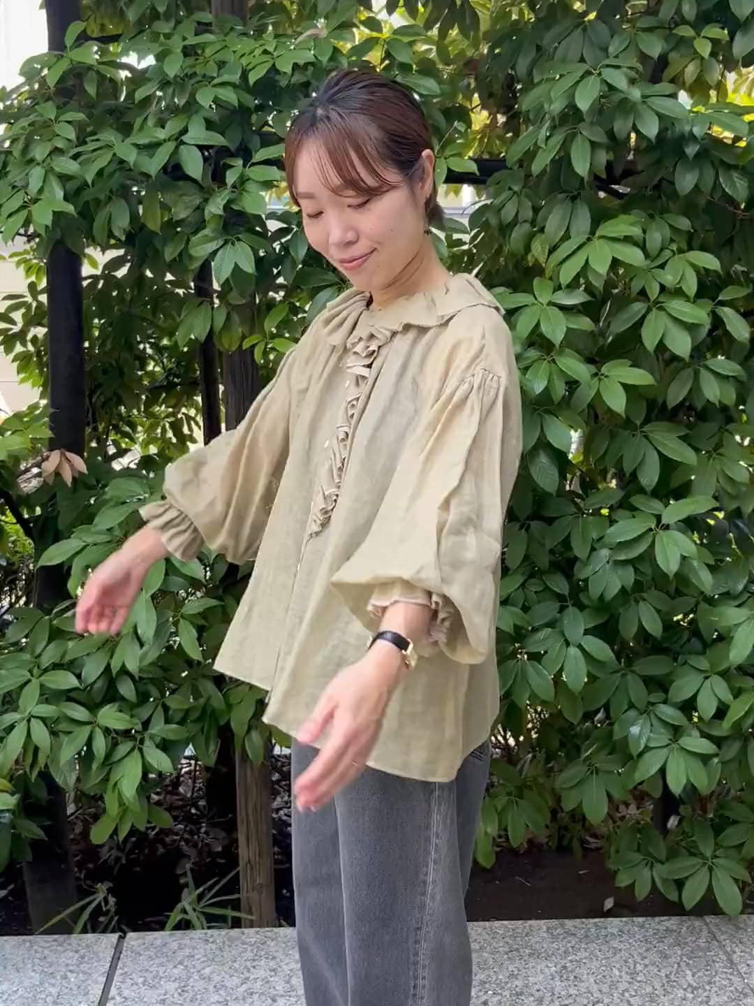 ガーゼのような素材のフリルブラウス。