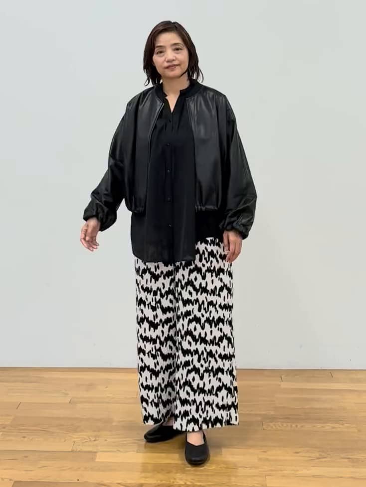 プリントパンツはモノトーン配色で大人っぽく、落ち感がきれいなのですらっと見えします。