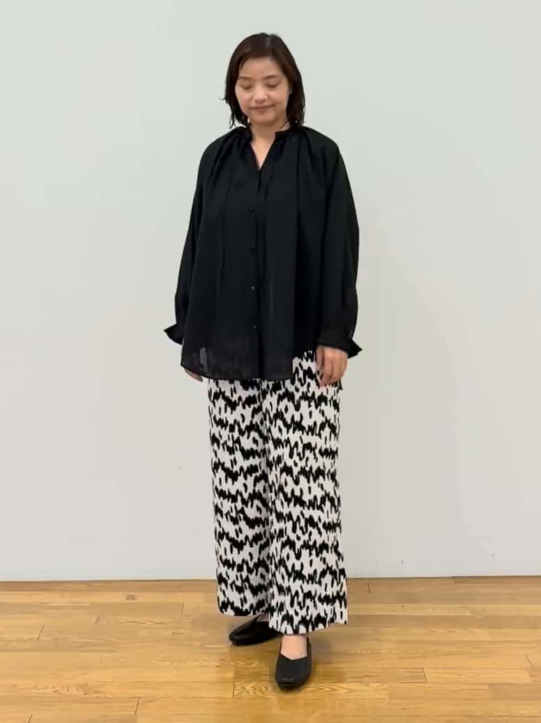 (ブラウスはゆったり、パンツは程よいサイズ感)