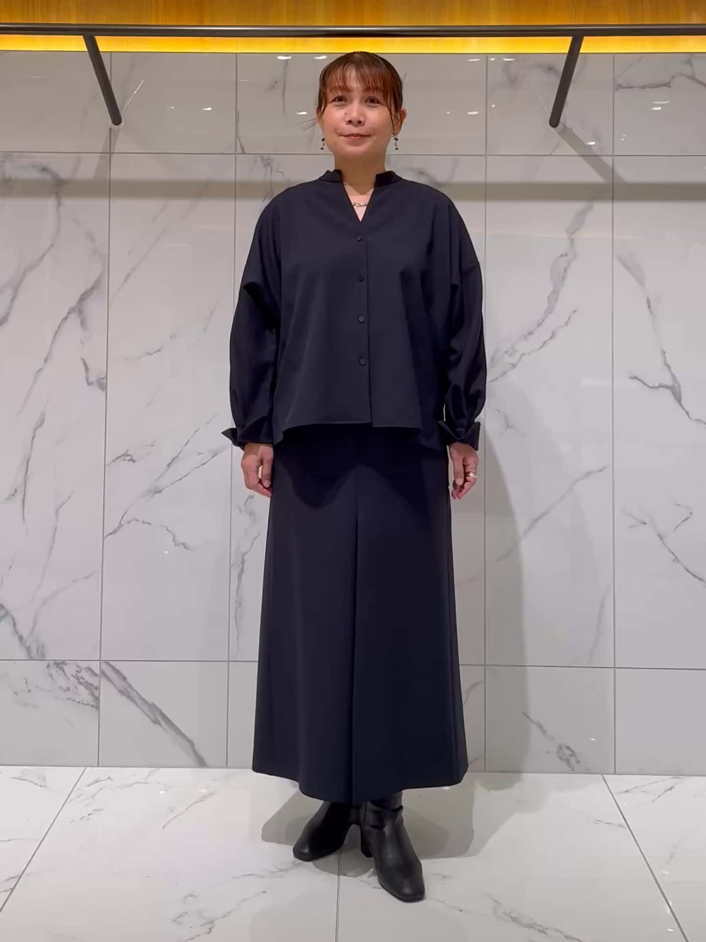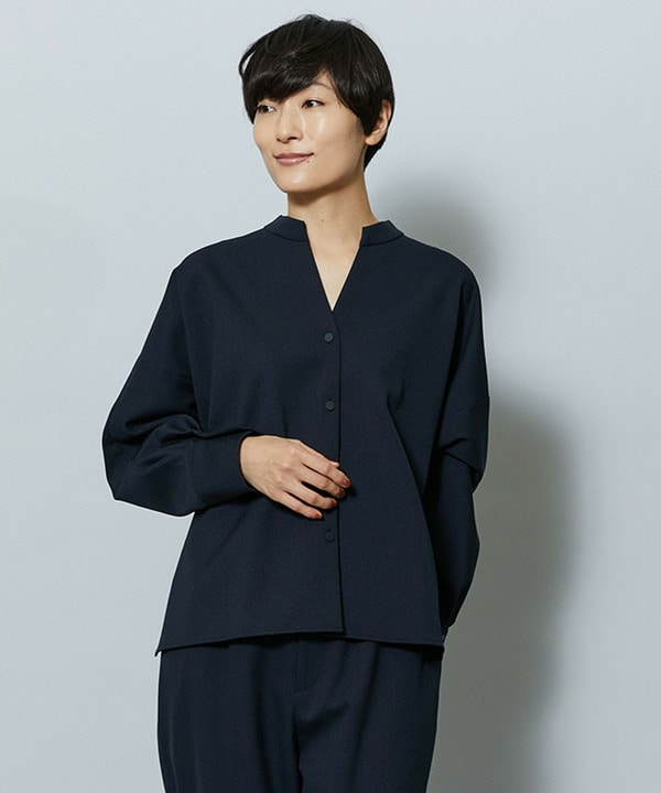 スキッパーシャツは首元がすっきり見えて、一枚でも羽織りでも使える万能アイテム。後ろのタックギャザーでふんわりとした立体感が出て、後ろ姿もきれいに決まります。