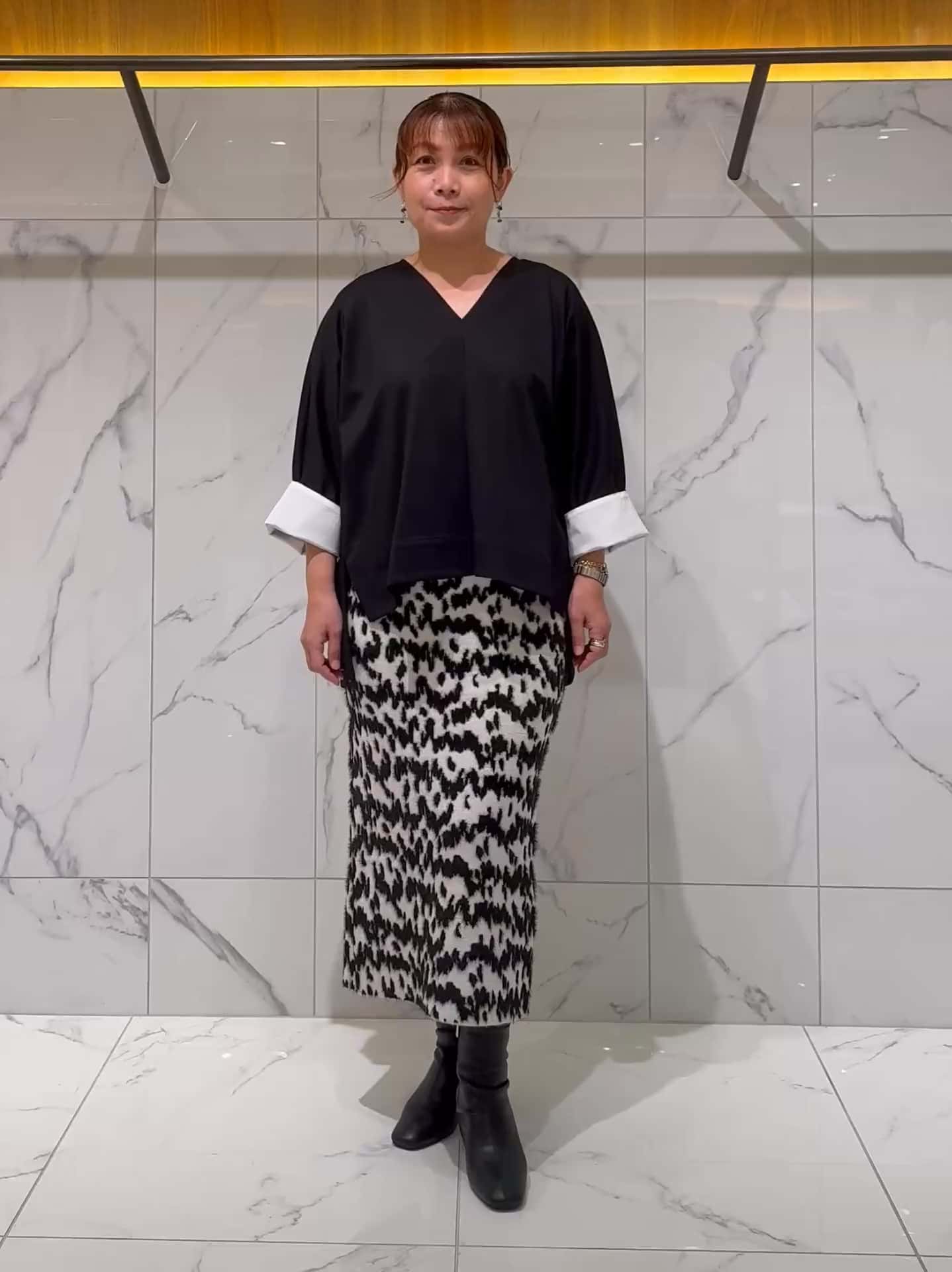 存在感のある柄もタイトシルエットで取り入れやすく、小柄な方でもバランスよくまとまります。