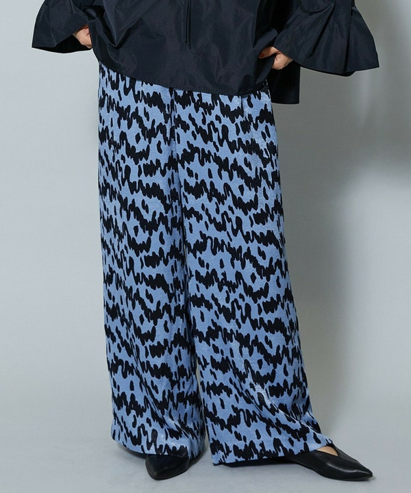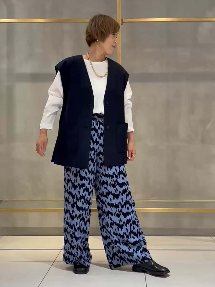 パンツは軽やかなサックスカラーのプリントで、全体を明るく上品にまとめました。
