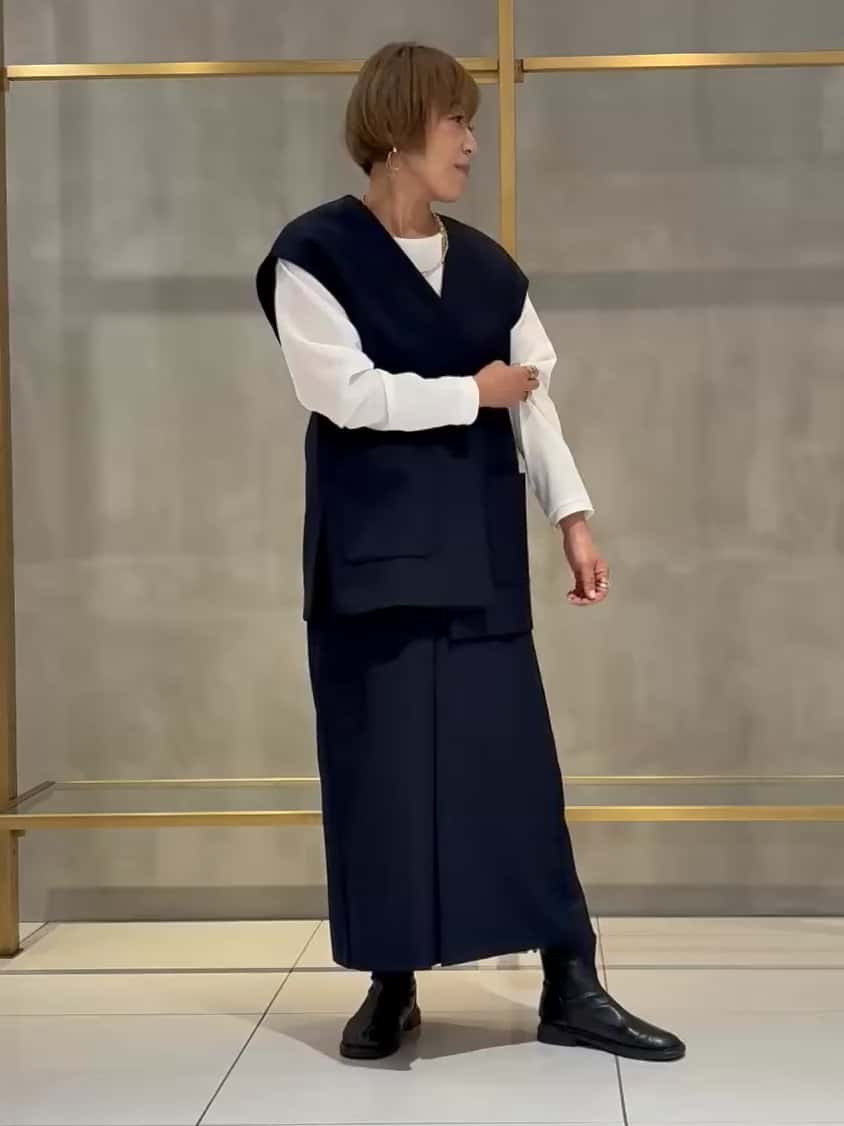 ジレはドロップショルダーで優しいフォルム。ノーカラーで首回りもすっきり◎ インナーのボートネックブラウスはゆったりシルエットでレイヤードも楽しめます。スカートは腰回りすっきり、フレアラインで女性らしさもプラス。セットアップでも単品でも活躍します♪