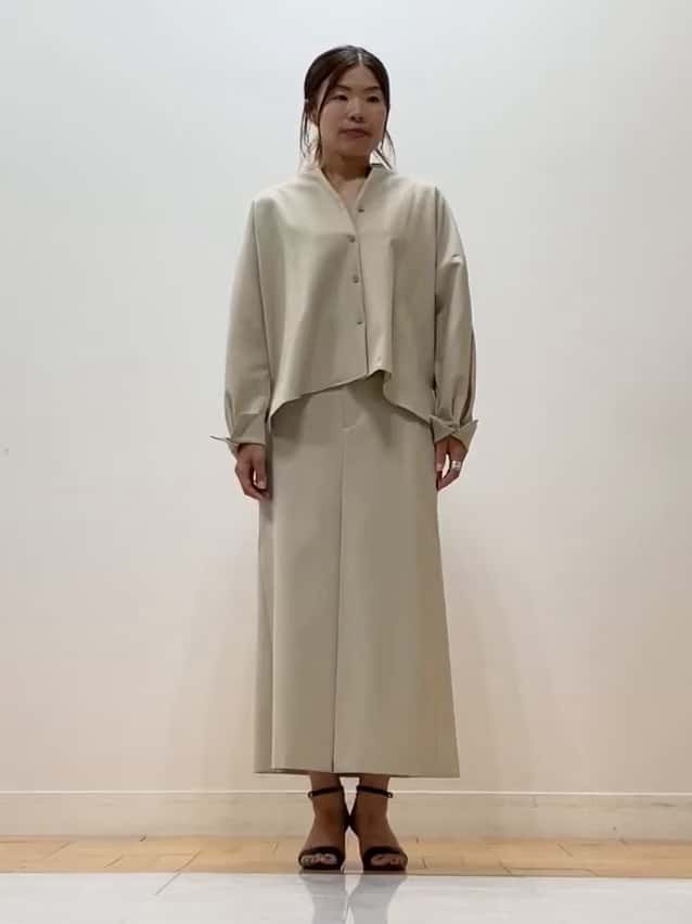 スッキリとした首元のスキッパーシャツに、同素材のマーメイドスカートを合わせたセットアップスタイル。シャツはドロップ&ドルマンスリーブでゆったりと、後ろタックのギャザーが動きのあるバックフォルムを演出。
