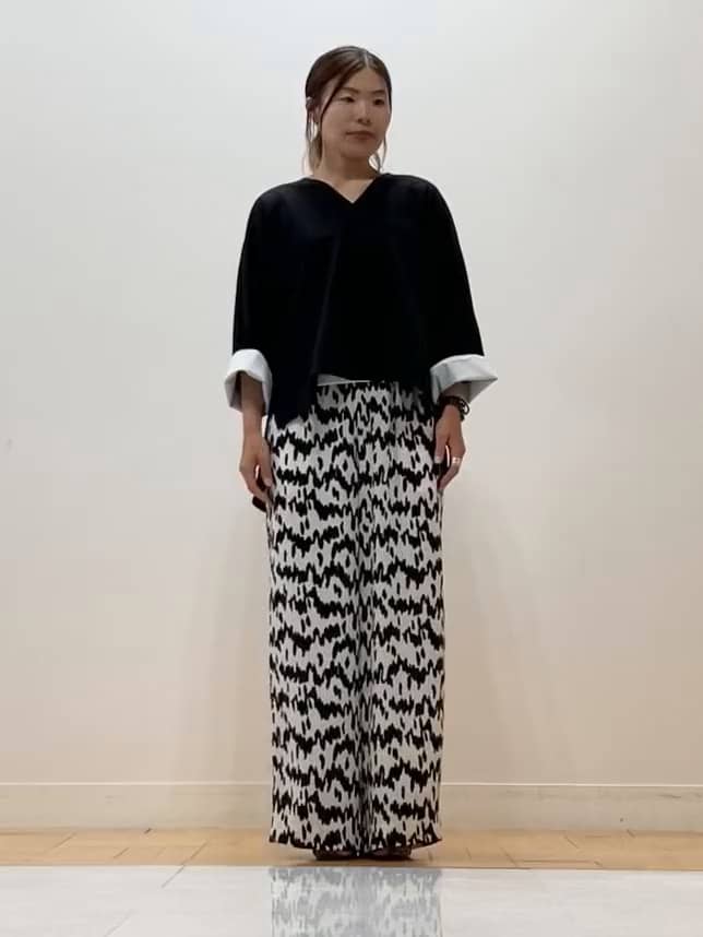 パンツは落ち感のある素材がラインを美しく見せてくれるので、インパクトのある柄も大人っぽく着こなせます。シックなカラーリングで、洗練された華やかさを演出してくれるスタイルです。