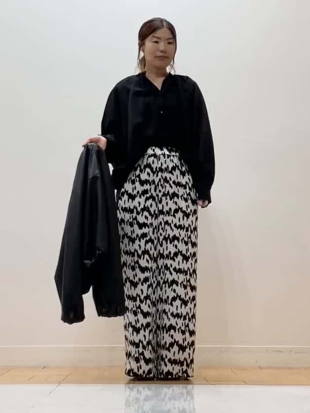 シアー素材のブラックブラウスは袖にボリュームを出しつつ、適度なハリでフォルムを美しくキープ。パンツは落ち感のあるモノトーンプリントでIラインを作り、すっきり大人っぽく。袖の透け感や裾のラウンドカットを活かして、シンプルながら表情のあるスタイリングに。