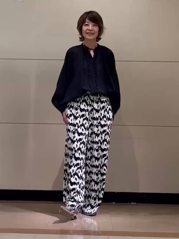 薄くてもハリ感のあるシアーボイル素材のブラウス。インパクトのあるプリント柄のパンツはモノトーン配色で大人っぽく。落ち感がありきれいなシルエットです。54EFB001 2号②ブラック 54EFP090 2号①オフ