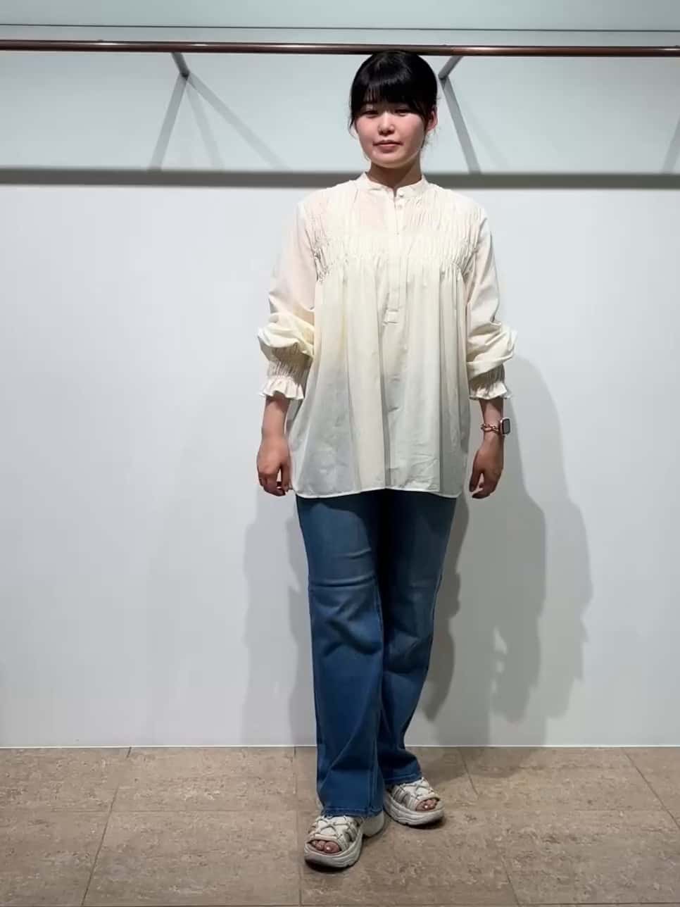 シャーリングが華やかなブラウス。袖口がゴムになっているので袖を上げてふわっと着ても素敵です。ボリューム感があるのですっきりシルエットのデニムと合わせました。54FFB580 2/① オフ54BFP521 1/① ブルー