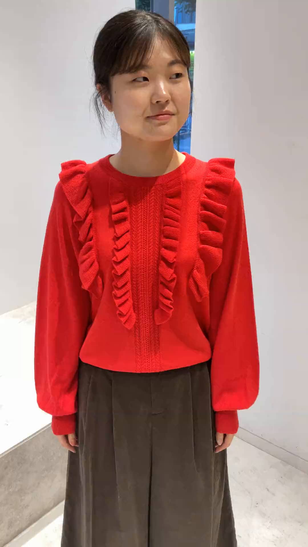 今季注目カラーのコーディネート。赤が効いたフリルがポイントの着映えするニット。リブがしっかり効いていて収まりが良いです。