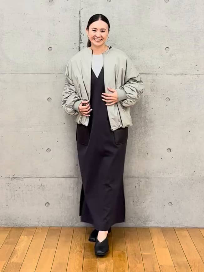 ライトグログラン素材のショートブルゾンは軽くて中綿入りでも膨らまず、ふんわりしたフォルム感が可愛い一枚。袖のシャーリングが華やかで、ラフに袖をまくってもバランスよく着られます。ジャンバースカートはポンチ素材で着心地が良く、裾に向かってスッキリ見えするライン。サイドスリットやレザーの切り替えがアクセントになっています!