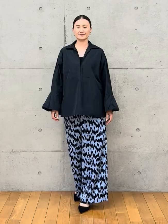 ブラウスは、軽くてハリがあり、着るだけで立体的なシルエットに。大人っぽさの中にほんのり甘さがある表情で、シンプルながら存在感のある一枚です。パンツはしなやかな落ち感のあるプリント素材で、動くたびにきれいなラインをキープ。モノトーン配色の柄なので派手にならず、サックスカラーが爽やかに映えてコーデがぐっと洗練されます。