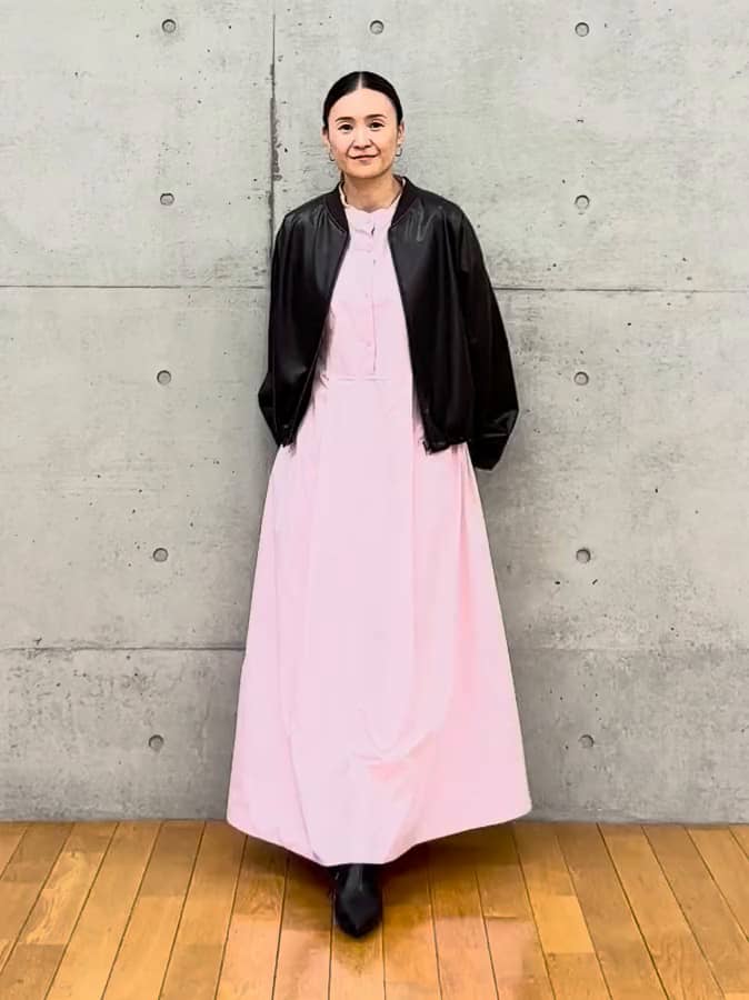 シアー感のあるピンクのワンピースに、フェイクレザーのブルゾンをさらりと羽織ってみました。ゆったりとしたフォルム感ながら上品な微光沢のおかげで、大人っぽくすっきりと見えるのが嬉しいポイント。裾のゴムを絞ってブラウジングするとワンピースとのバランスも良く、甘さを程よく引き締めてくれます。ワンピース一枚はもちろん、ブルゾンを羽織ったコーデもおすすめです。