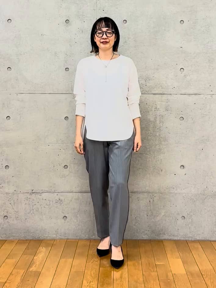 合わせたグレーのヘリンボンパンツは、センタープレスとすっきりシルエットで脚長効果抜群。パイピングのラインもさりげないポイントになり、シンプルながら着映えする組み合わせです。
