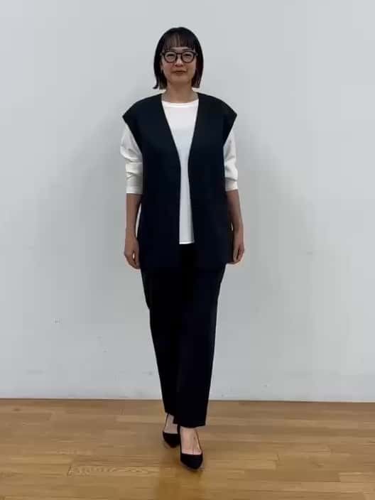 シャリ感のあるジレはノーカラーですっきり見え。ドロップショルダーで肩まわりもリラックスしつつ、程よい分量感で優しい印象に。
