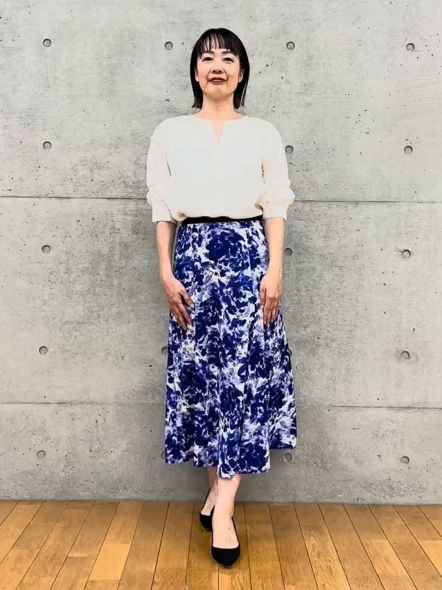 オフのブラウスは昨年も人気素材のシリーズで、抜け感のあるTネックと裾に向けて広がる女性らしいライン、透け感のあるふんわり袖が上品なアクセントです。上品に広がるフレアーラインのプリントスカートは歩くたびに揺れるシルエットが華やかさをプラスします。