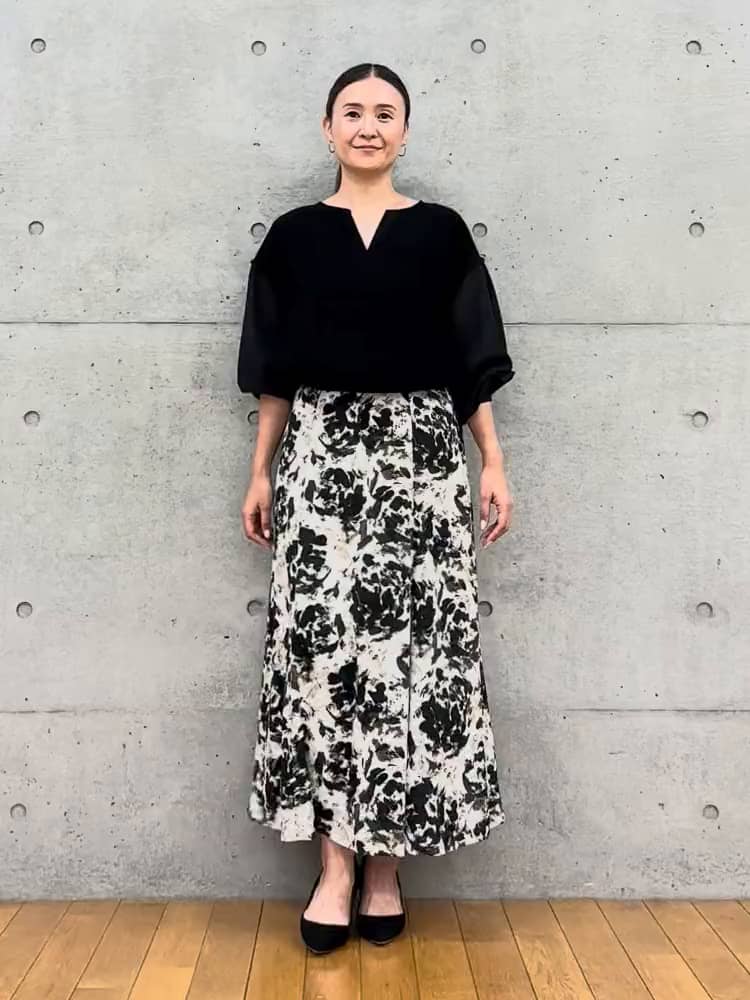 抜け感のあるTネックブラウスに、柔らかく軽やかなフレアスカートを合わせたセットアップスタイル。ブラウスのふんわり袖と裾の広がりが女性らしさを演出し、スカートのプリントが動くたびに上品に揺れて華やかさをプラス。上下の素材感の違いが程よくメリハリを出し、カジュアルすぎずきれいめにも着こなせるバランスの良いスタイリングです。