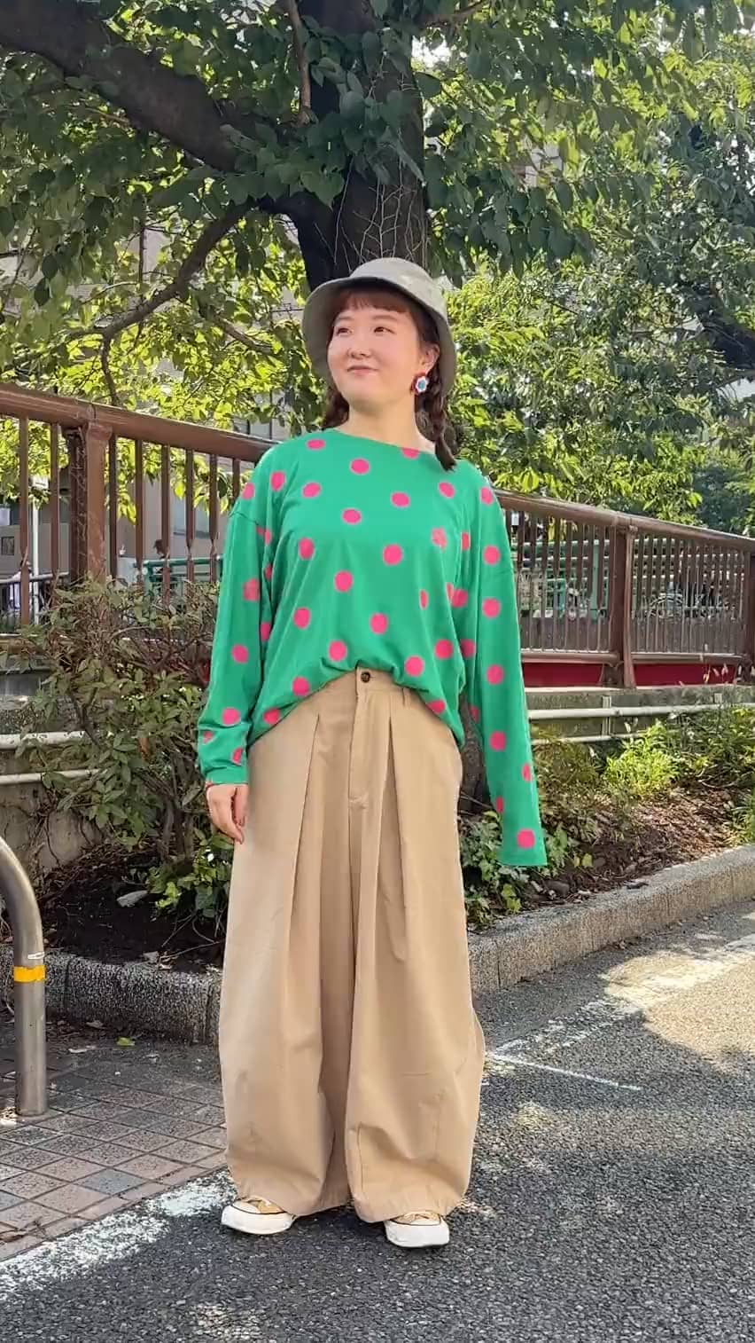 大きめのドット柄がアクセントになり、コーディネートの主役になる一枚です。