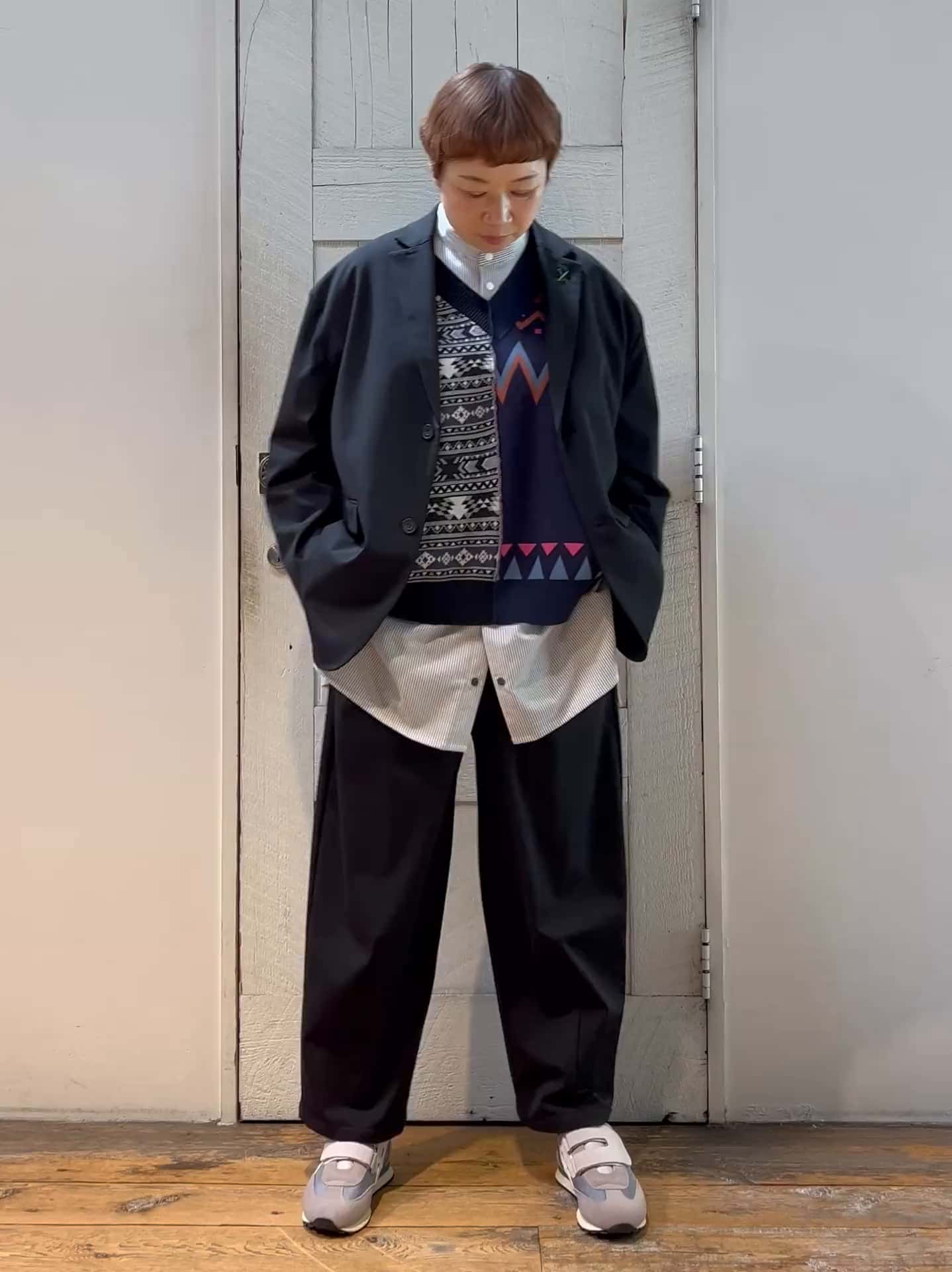 着用感 : ワイドシルエットの綿ニットベストは、短めの丈感で軽いイメージに。