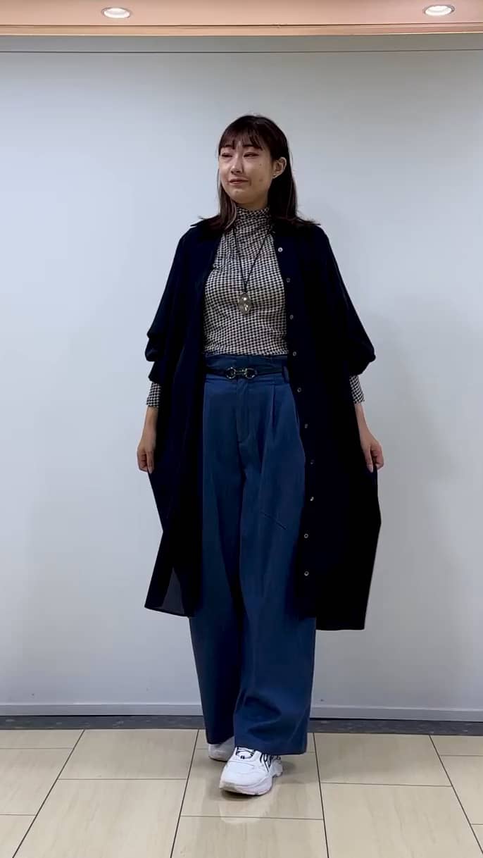 着用感:デニムライクな素材のワイドパンツです。ウエストがゴム仕様なので、腰回りがすっきりして見えます。