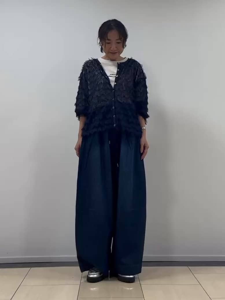 フリンジの表情感が華やかなネイビーのカーデを主役に。インにはナチュラルカラーのロゴ刺繍カットソーを合わせ、軽やかさをプラス。ボリューム感のあるコクーンデニムを選んでも、コンパクトな着丈とのバランスで小柄の方も着やすいスタイリングに◎