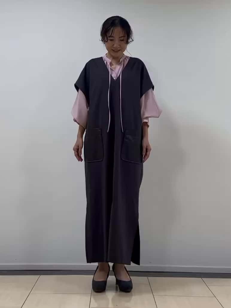 ピンクのシアーブラウスは軽やかで袖のドロップラインが女性らしい動きをプラス。ブラウンのジャンバースカートを重ねて、裾に向かう細見えラインで全体をすっきりまとめました。サイドスリットとフェイクレザー使いがアクセントになり、動きやすくおしゃれに着られます。
