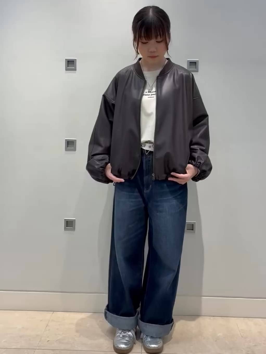 レザーのブルゾンとワイドデニムの組み合わせでカジュアルなコーディネートに。