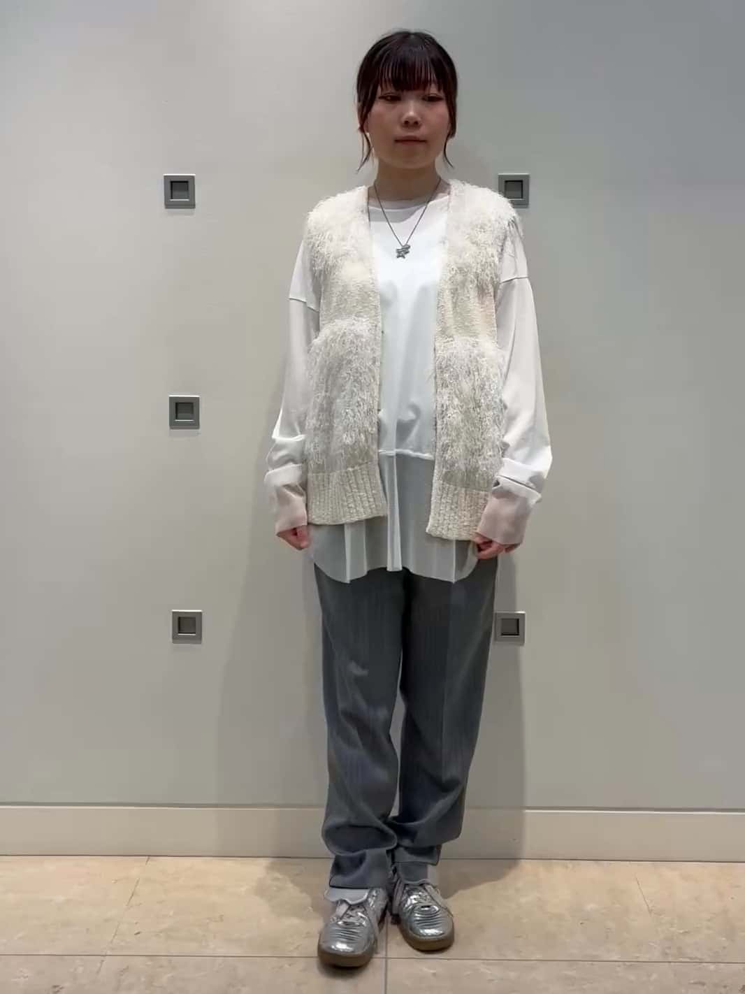 カーディガンは毛足のあるフリンジ素材で、シンプルなデニムと合わせても映えるコーディネートに。