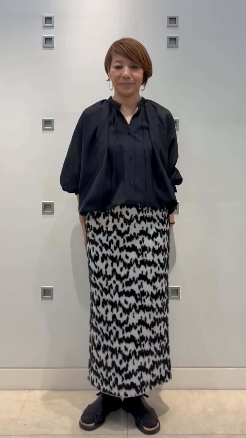 デザイン性が高くシアー感のあるブラウス。存在感のあるレオパード柄のスカートを合わせて大人っぽく。自然なフィット感でシルエットもきれいです。54EFB001 2②ブラック54ZKS333 2①オフ