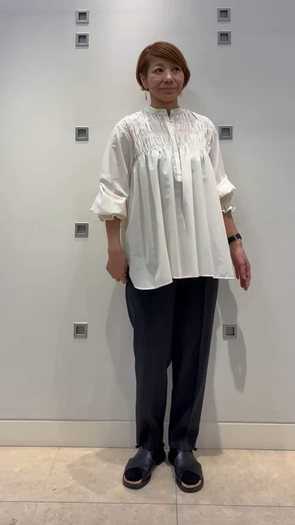 袖口のフリルとシャーリングが特徴です。ふんわりとしたシルエットにストレッチの効いたテーパードパンツを合わせてみました。54FFB580 2①オフ54BFP093 2②チャコール