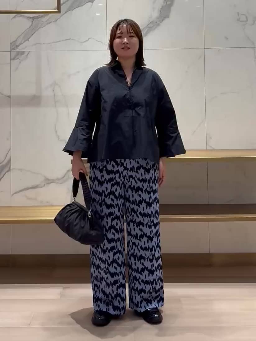 シックなサックスプリントパンツに、軽やかなネイビーのプルオーバーシャツを合わせた大人のレイヤードスタイルです。パラッとしたタフタ素材がシルエットにモード感をプラスし、ワイドパンツの落ち感と相性抜群。深みのあるネイビーが上品さを引き立て、程よく華やかさを演出します。