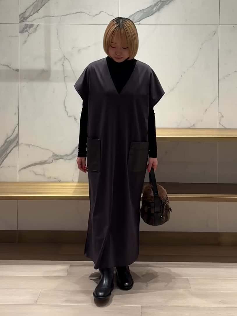 定番のブラックハイネックインナーは、肌に張りつかずサラリとした着心地で毎年人気です!今回はブラウンのジャンバースカートと合わせてみました。裾に向かって細くなるラインと深めのサイドスリットで女性らしさが出せますし、フェイクレザーの部分使いがアクセントになって動きやすく、スタイリッシュに決まります。